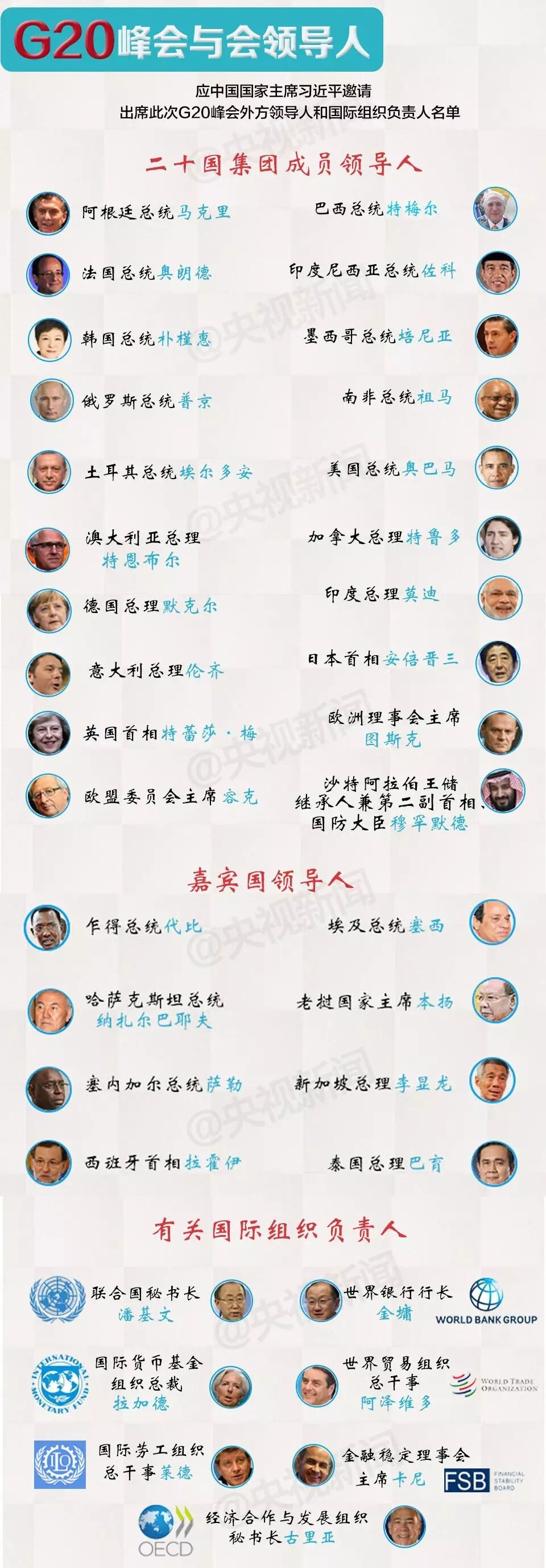 应习近平主席邀请,此次共有40位二十国集团成员领导人、8位嘉宾国领导人、7位国际组织负责人来参加G20峰会。